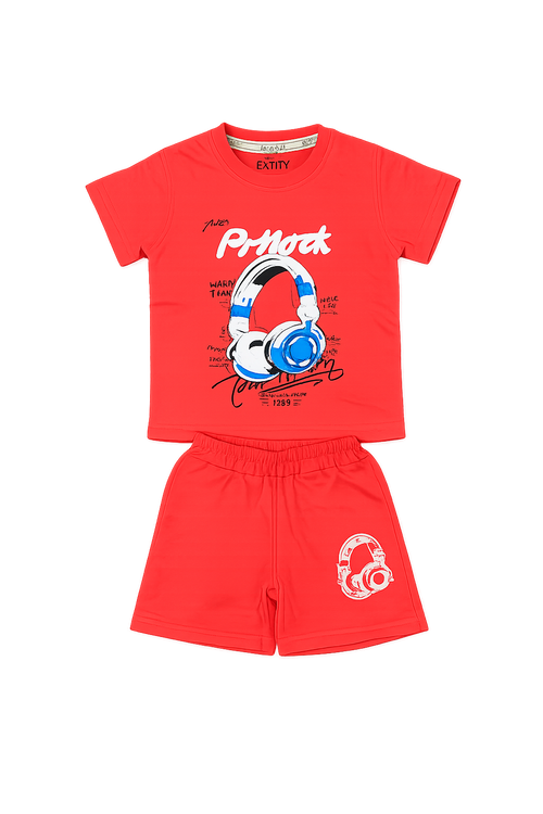 Boys Red T-Shirt & Shorts Set – Headphone Print Kids Summer Outfit